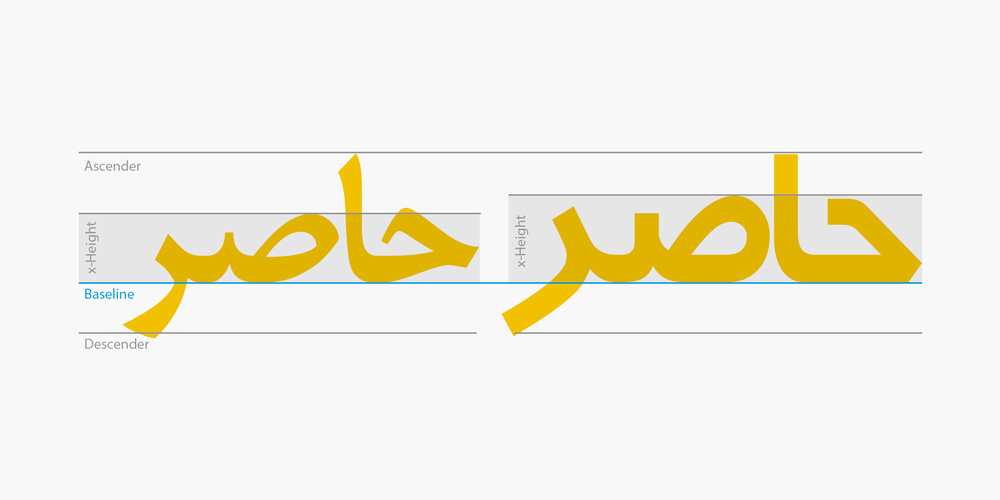 در تایپوگرافی، x-height فاصله بین خط پایه (Baseline) و خط میانگین حروف کوچک در یک تایپ فیس است. اگر بخواهم ساده تر توصیف کنم، باید بگویم x-height همان ارتفاع حرف x کوچک است. به طور قطع نمیتوان معادلی برای x-height در تایپوگرافی فارسی پیدا کرد. در تایپوگرافی فارسی حروف آزادانه تر بین کرسیها بالا و پایین میشوند و تلاش برای ایجاد x-height شاید باعث حذف ظرافتهای حروف شود.